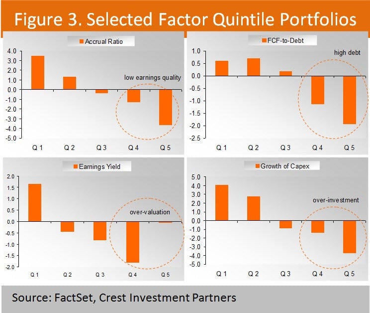 This risk is inherent to individual stocks and has three components: a) earnings persistence: a decline in earnings power reduces the equity value; b) distress: high debt leverage constrains growth and may result in bankruptcy; c) valuation: stocks trading at high multiples are riskier and tend to underperform. Indeed, empirical evidence shows that stocks with specific fundamental attributes such as low earnings quality, high debt leverage, and high valuation multiples historically have significantly underperformed the market averages. Figure 3 shows the excess returns of selected factor portfolios versus the universe average over the 1990-2014 period. For example, the stocks in the bottom quintile (quintile 5) by accrual ratio underperformed the market average by over 300 basis points per year over the period under study. Conversely, stocks in the top quintile (quintile 1) outperformed by over 300 basis points. A similar return pattern is observed for the other three factors: Companies with high (low) debt-to-cash flow, high (low) reinvestment rates and low (high) earnings yield, under (out)-performed significantly over the same period.