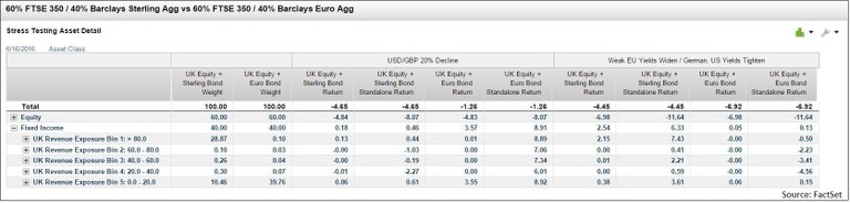 Using FactSet’s Multi-Asset Class risk model, we then simulate several market shocks to represent outcomes of the UK leaving the EU and measure the expected return impact on the mock portfolios. The shocks used are: