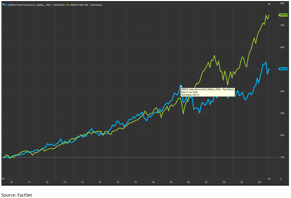 Electricity utility companies have long been a reliable choice for investors, known for their stable income and consistent dividends. However, since 2020 they have experienced underperformance and diverged from S&P 500 total returns. This sector hasn’t quite kept up with its historical performance levels, but fortunately there's renewed optimism on the horizon.
