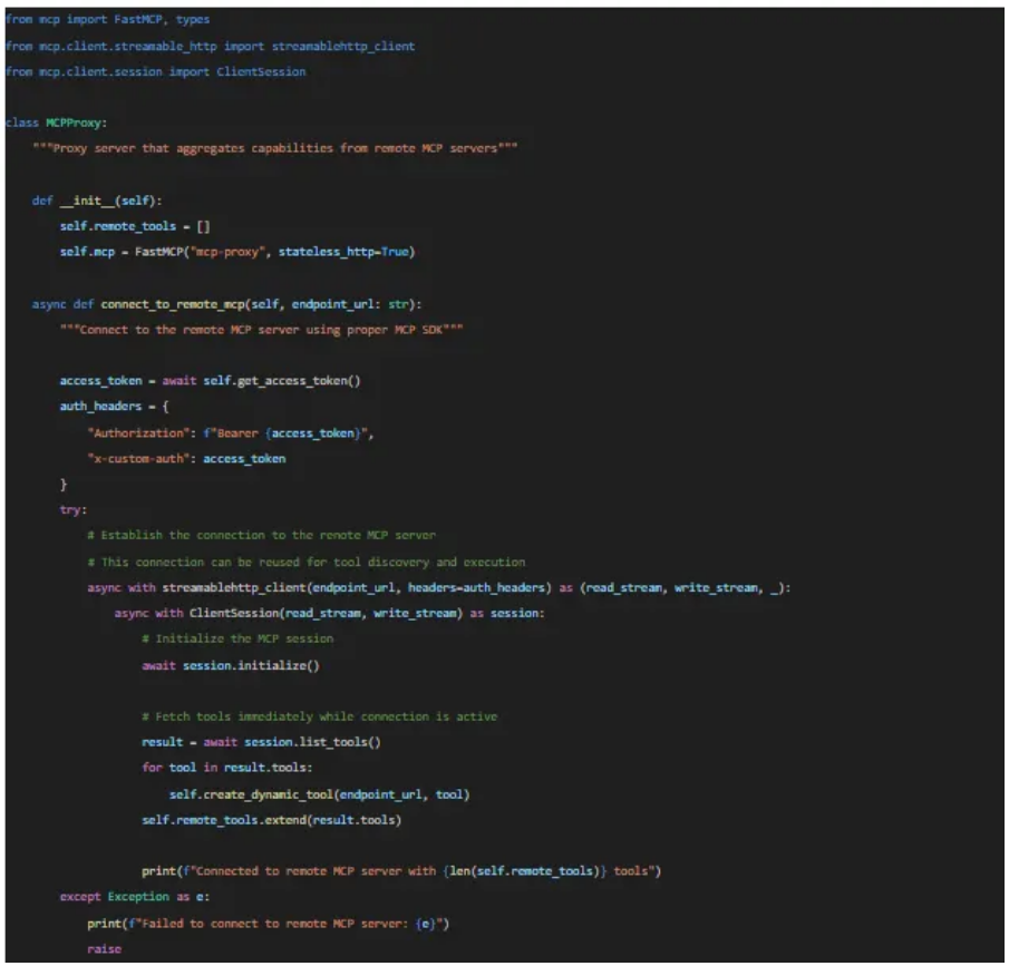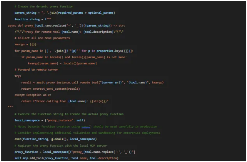 A dynamic registration approach is necessary because at development time, you don’t know what tools will be available from backend servers. The proxy discovers capabilities at runtime and creates matching local functions that maintain the original tool signatures while adding proxy logic for routing and error handling.