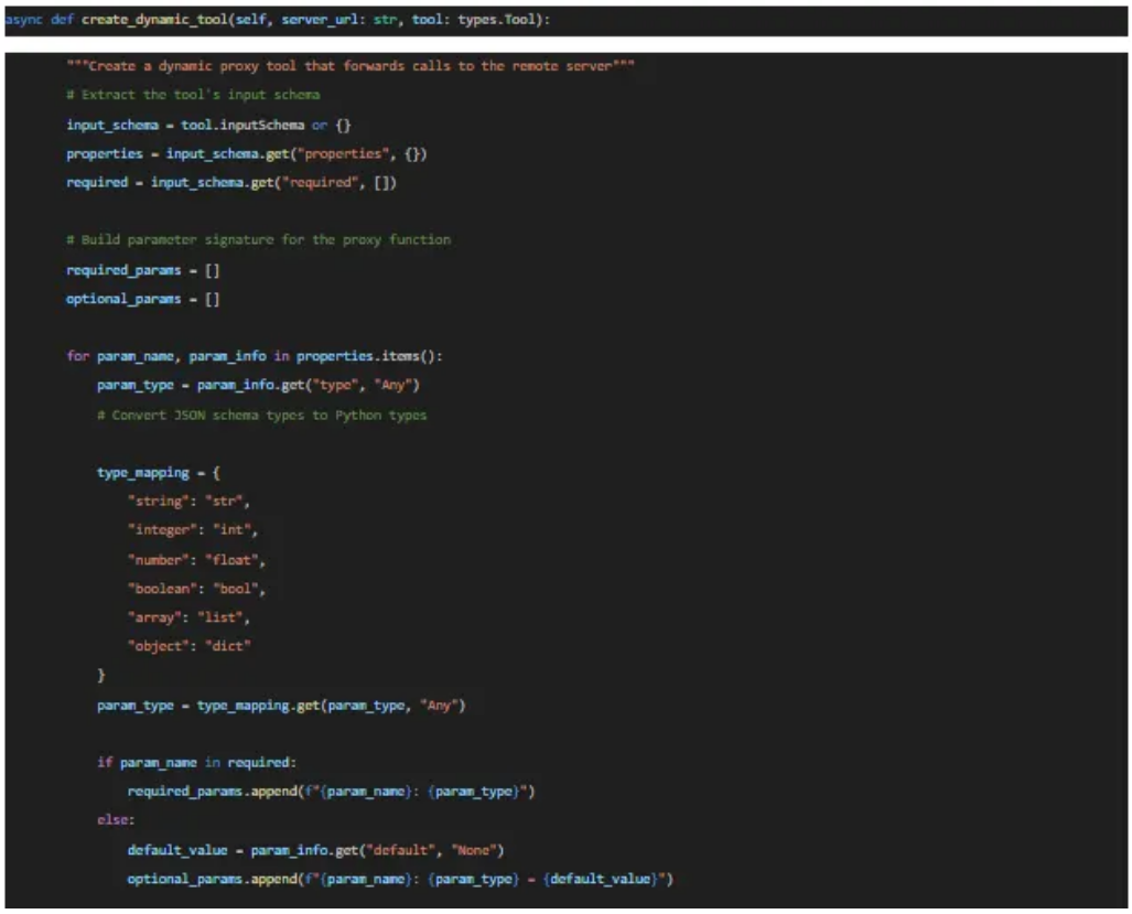 The most complex part of implementing a proxy is dynamically registering tools from backend servers. MCP tools have schemas that define their parameters and behavior; the proxy must discover these schemas and create local proxy functions that match the original tool signatures: