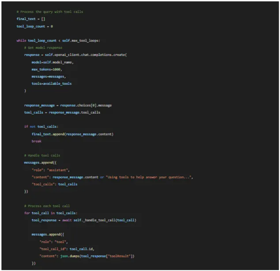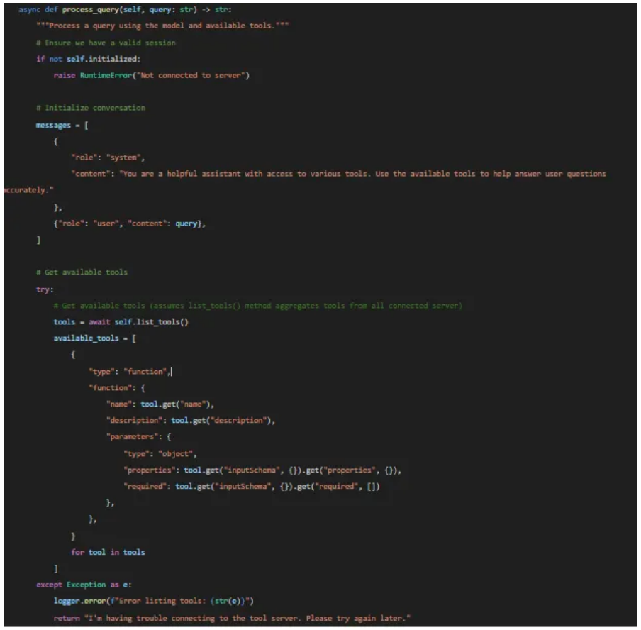 The client establishes a connection to the MCP server and dynamically discovers available tools, converting MCP tool schemas into OpenAI’s function-calling format. This abstraction allows the same client to work with any MCP-compliant tool server without modification.