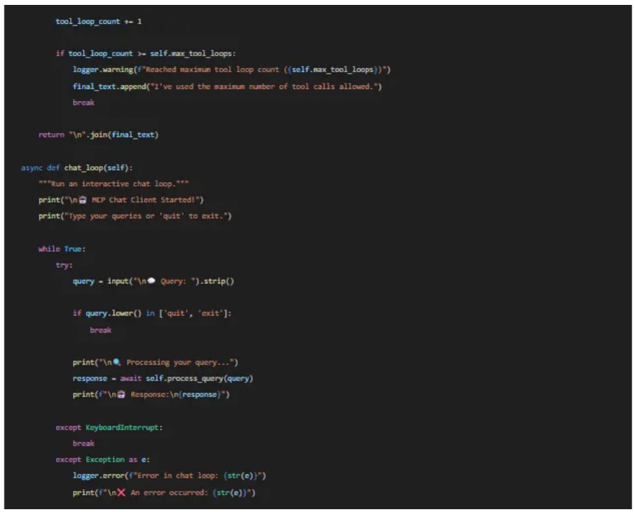 The core loop implements sophisticated orchestration: The LLM decides which tools to call and when, the client executes those calls against MCP servers, and results feed back into the conversation context. The loop limit prevents infinite recursion while allowing flexible multi-step reasoning.