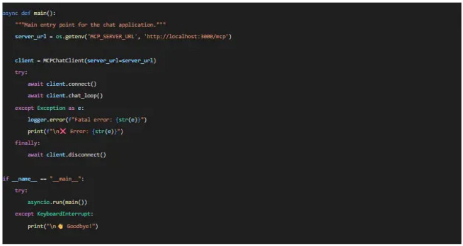This client implementation demonstrates the fundamental architecture of an MCP-enabled conversational AI system, showcasing how to bridge the gap between language models and distributed tool ecosystems. Let’s review of the entire client application and point out several important factors to consider when deploying MCP in enterprise applications.