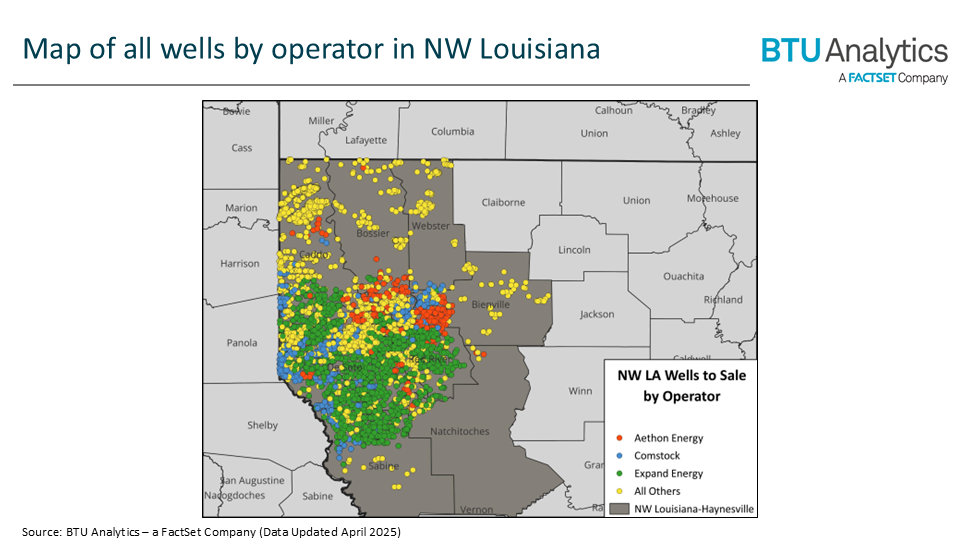The below map reveals where the core operators are focusing their NWLA activity. Considering the activity of the three operators back to 2010, Aethon Energy has the smallest spread of wells, which is concentrated in the core of the play and spreads east into Bienville Parish. Comstock on the other hand is spread horizontally across the middle of the region and along the western border of the state. Expand Energy, formerly Chesapeake Energy Corporation and Southwestern Energy Company, has focused activity across the southern half of the region.