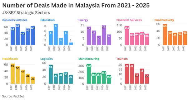 FactSet private markets and M&A data show that despite a post-pandemic decline in deal counts, both total and average deal values in Singapore, Johor, and the broader JS-SEZ corridor have continued to rise. Following the cheap capital spike of 2021–2022, investors are now deploying larger amounts into fewer, more strategic transactions. That indicates a shift from opportunistic funding to long-term platform and infrastructure investments linked to the corridor.