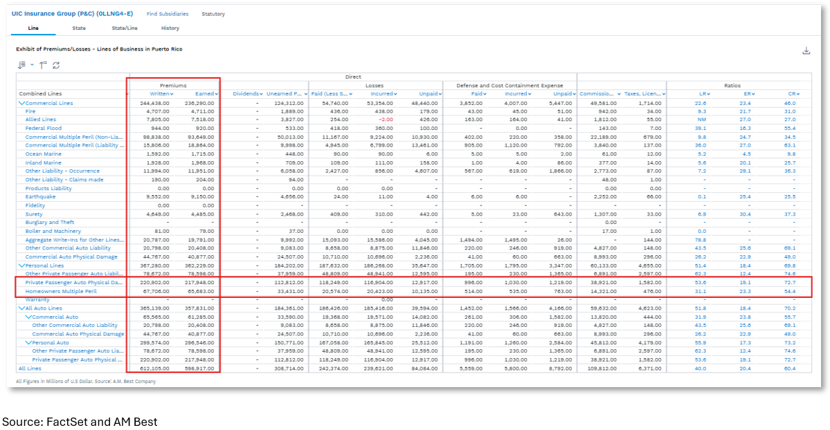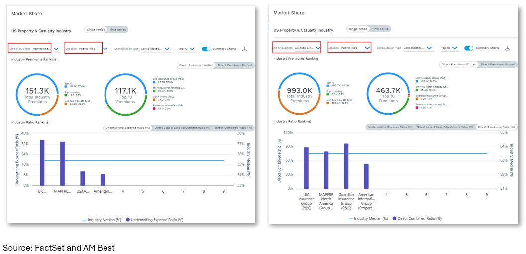 While total losses related to Hurricane Melissa have not been collected and released, FactSet data and functionality is available to assess a company’s potential exposure to such an event based on premium market share by geography and line of business. The figures below show the market share for homeowner and auto premiums written in Puerto Rico. FactSet market share functionality, driven by data pulled from statutory statements, shows that UIC Insurance Group, a subsidiary of The Universal Group of Cos., writes over half of these total premiums and can be expected to share in a similar percentage of total homeowner and auto losses.
