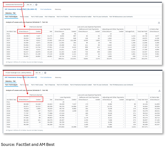 The final slice of premium datal is from schedule P, which includes detail on the level of ceded premiums. Ceded premiums could help UIC reduce its losses.