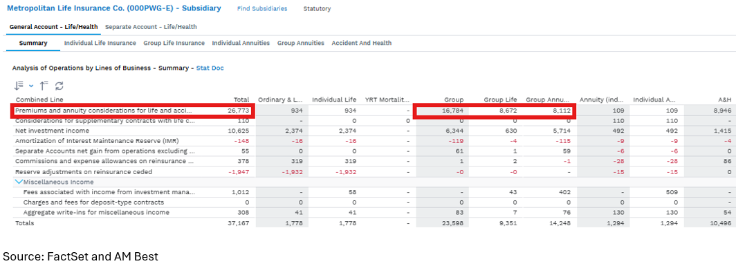 To assess the potential impact on a company’s total premiums, detailed premium data is available in the Operations by LOB. In the case of Metropolitan Life Insurance Co., MetLife, Inc.’s largest subsidiary, the impact on declining jobs would impact the premiums of the three group businesses highlighted below. In the case of this subsidiary, the data in the Operations by LOB report shows that a decline in group premiums would have a meaningful impact on total premiums.